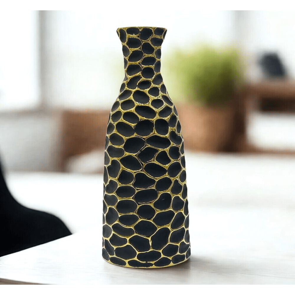 Elevate your home decor with this stunning Black and Gold Matte Finish Flower Vase. Featuring a unique honeycomb-inspired design, this vase combines contemporary elegance with timeless appeal. The deep black base is beautifully contrasted by gold accents, creating a striking, sophisticated look that complements modern, minimalist, and eclectic interiors alike.